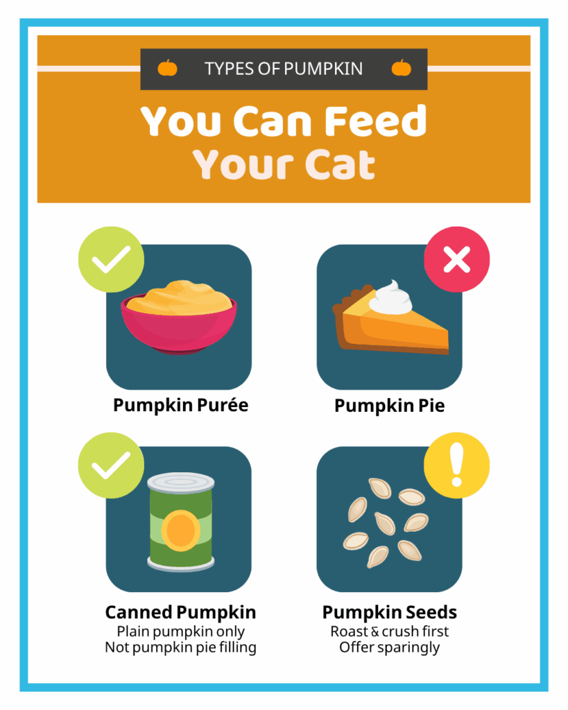When adding pumpkin to your cat’s diet, it’s important to know which forms are safe and which should be avoided. Here’s a quick guide for each type.